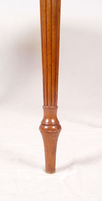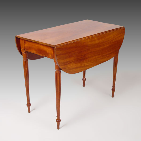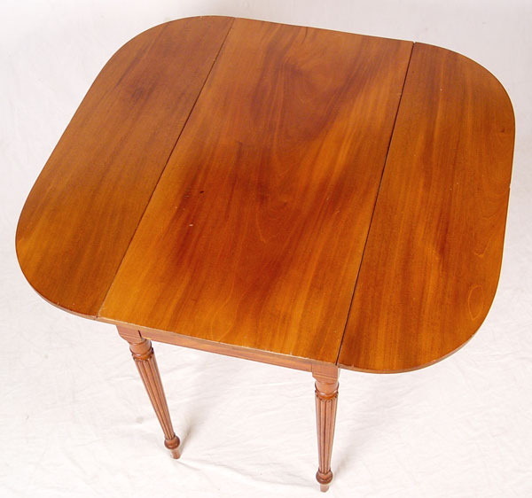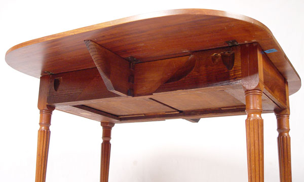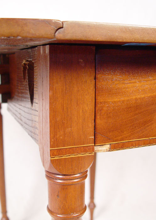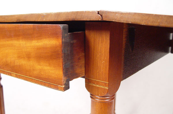 19TH C SHERATON TWO DRAWER DROP LEAF TABLE: With delicate parquetry inlay along the apron, single board top, rounded corners on the drop leaves, reeded legs. Please note veneer chips on drawers. 29 1/2''h x 36'' x 18''. Extends to 38''.