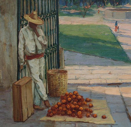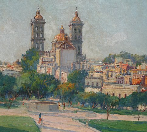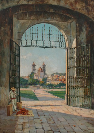 MAYORGA, Guillermo, (Mexican, 1890-1962): ''Puebla'', an expansive landscape of the artist's homeland, through the city gate, with fruit seller at the entrance, OIL/Canvas, signed, 41 1/2'' x 29 1/2'', frame 47'' x 35 1/2'', titled verso. Est. $4000/6000**