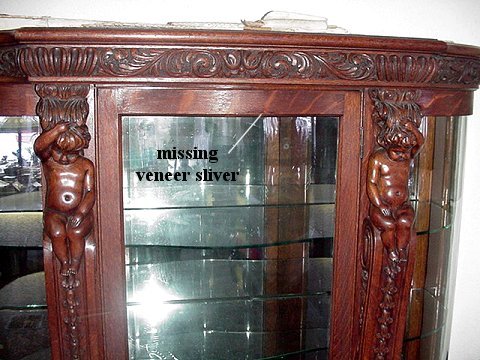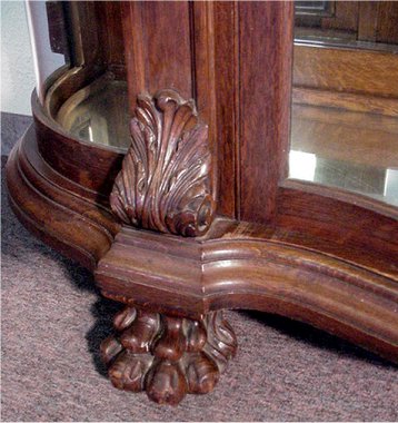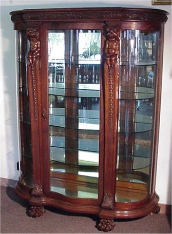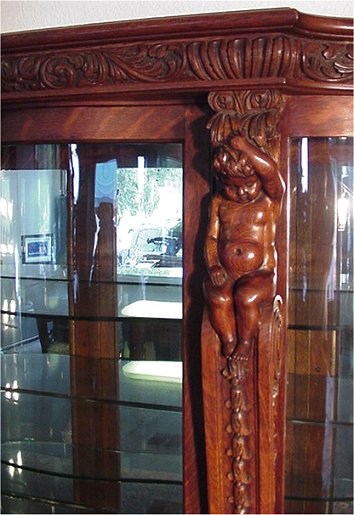 HORNER CHERUB CARVED QUARTER SAWN OAK CURIO CABINET: Horner attribution. Carvings throughout featuring full bodied cherubs topping scrolled stiles with a continuing bellflower. Top molded crest with relief carvings, claw feet. Mirrored back interior with glass shelves. Center serpentine glass door, curved glass side panels. 69''h, 52''w., approx. 22''d.