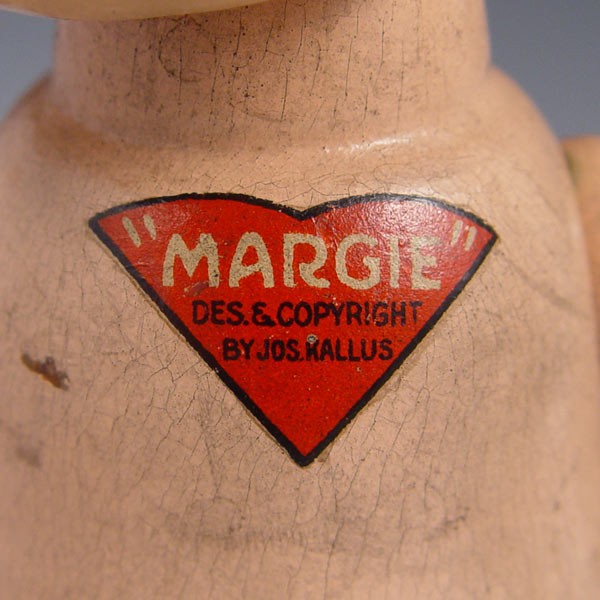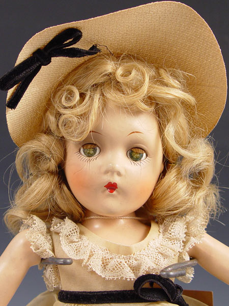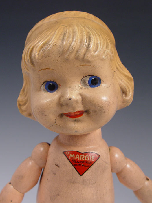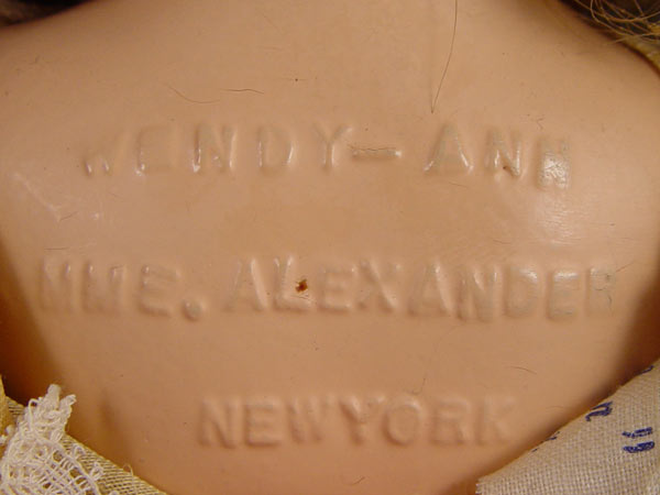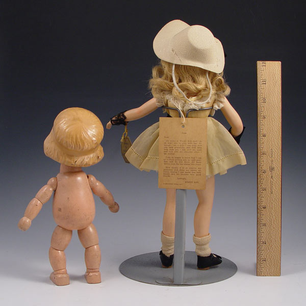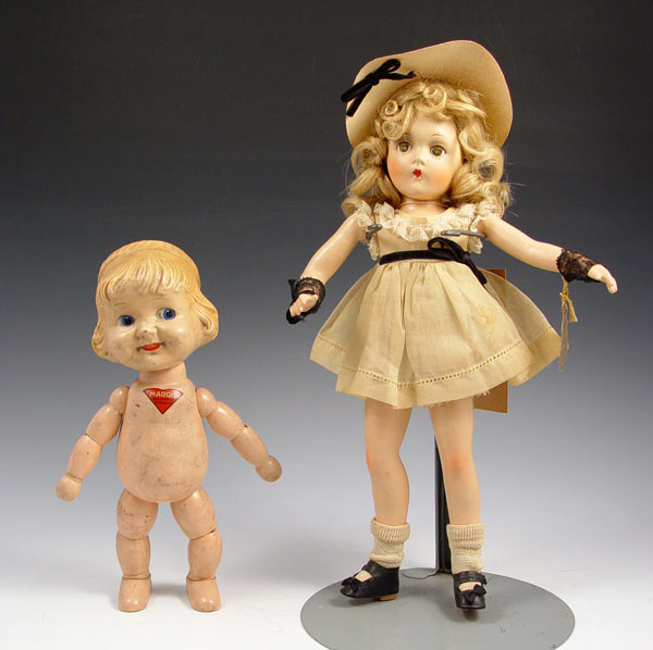 2 VINTAGE DOLLS MADAME ALEXANDER WENDY ANN AND KALLUS MARGIE: 1) Madame Alexander composition Wendy Ann with original clothes, post card and tag. Sleepy eyes are cloudy. 13'' tall. 2) Wood Joseph Kallus doll, label on chest, composition head, 9'' tall. Please note both dolls have slight cracks on the face. Est. $150/200**