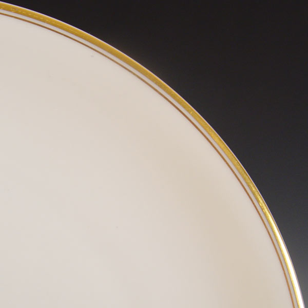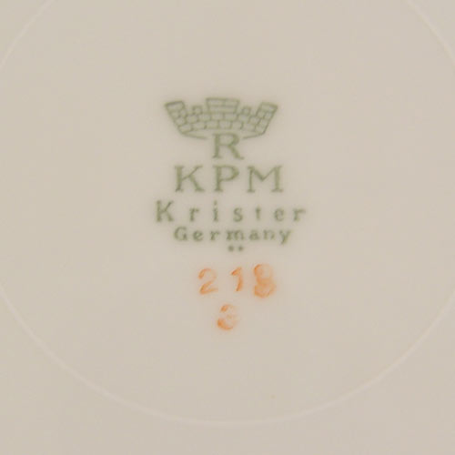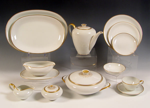 KPM KRISTER GOLD RIM FINE CHINA SERVICE FOR 12: 93 pieces to include 12 each of dinner plates, salad plates (1 chip), bread plates, soup bowls, dessert bowls, cups and saucers. Serving pieces are the gravy boat, cream pitcher, covered sugar, coffee pot, covered vegetable, open vegetable, relish dish, and 2 platters, 13 and 14.5''.
