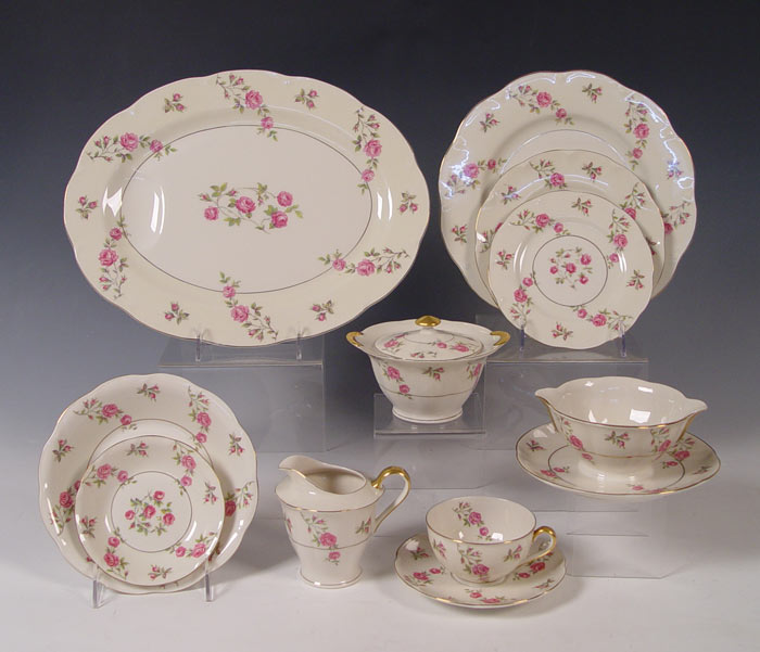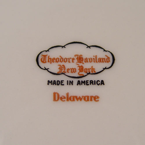 ''DELAWARE'' THEODORE HAVILAND NEW YORK LIMOGES FINE CHINA SERVICE: 77 pieces to include the 14'' platter, gravy, an oval and round vegetable bowl creamer and sugar. Also 8 dinner plates, 9 salad plates, 8 bread plates, 6 soup bowls, 13 dessert bowls, 11 cups and 16 saucers.