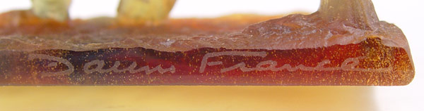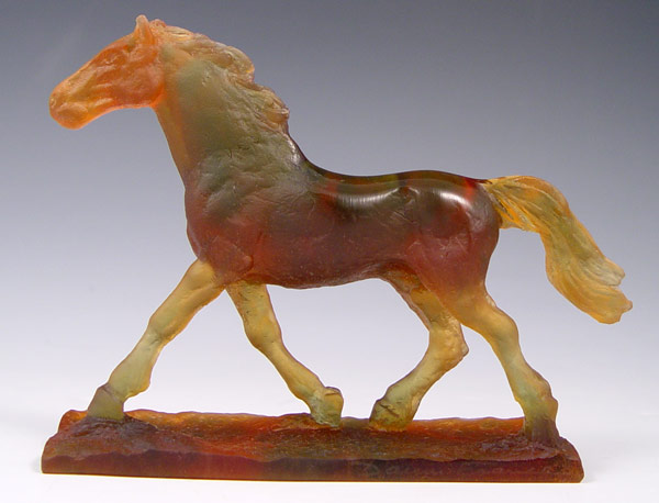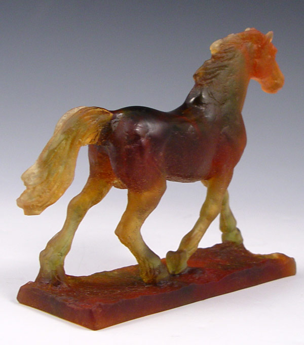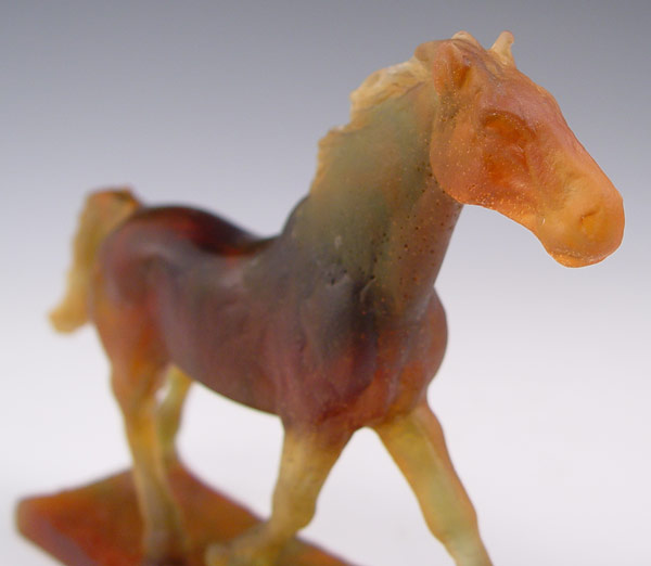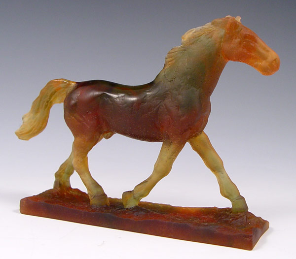 DAUM SIGNED PATE DE VERRE ART GLASS HORSE: ''Cheval Trotteur'', amber horse on attached stand, approx. 4 5/8''h. x 6''l., incised marks on side of base Daum France.