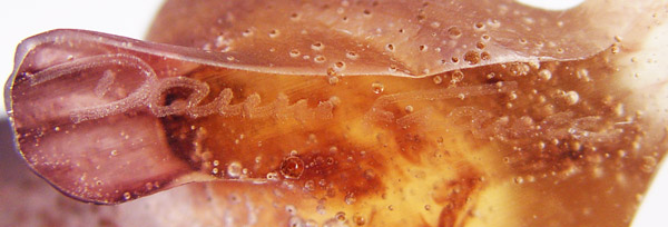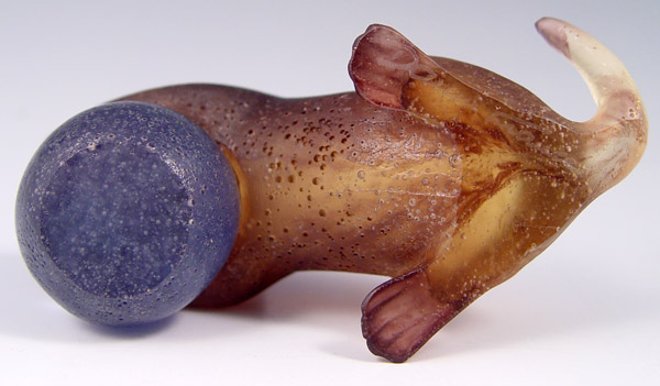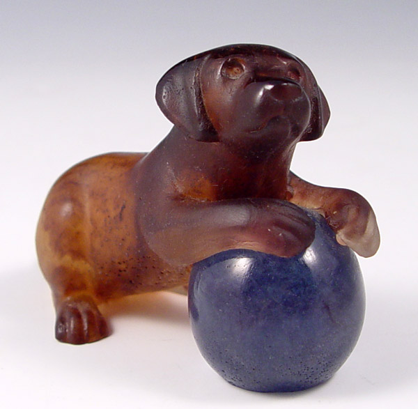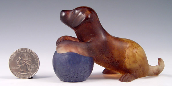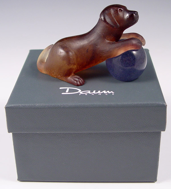 DAUM SIGNED PATE DE VERRE ART GLASS DOG WITH BALL: ''Chiot et Ballon'', amber dog with blue ball, approx. 2 1/4''h. x 3 1/2''l., incised marks on bottom of left rear leg Daum France, sold with original box, 3''h. x 4 1/2'' x 4 1/2''.