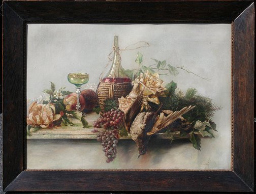 ILLEGIBLY SIGNED STILL LIFE WITH GROUSE, WINE DECANTER & GLASS, GRAPES AND APPLES: OIL/Canvas, 23'' x 32'', period wood frame with wear, 29'' x 37''. Est. $400/600**