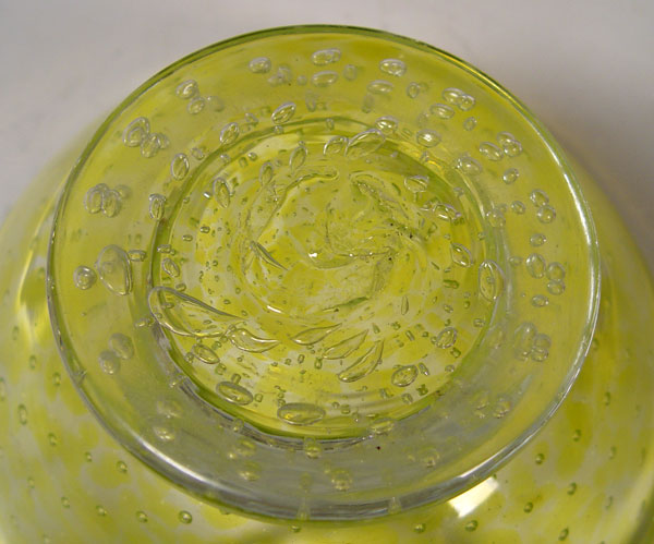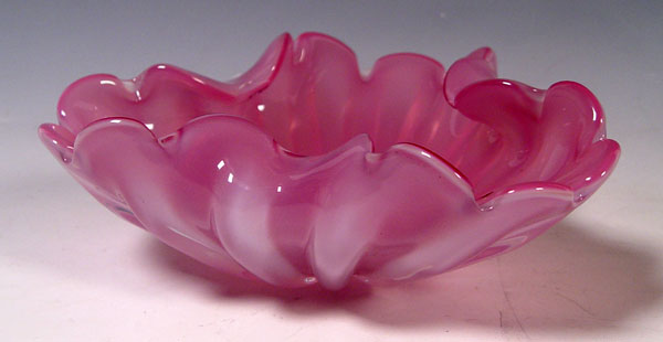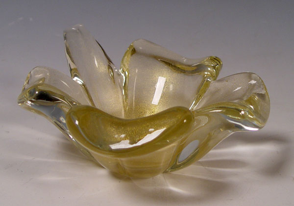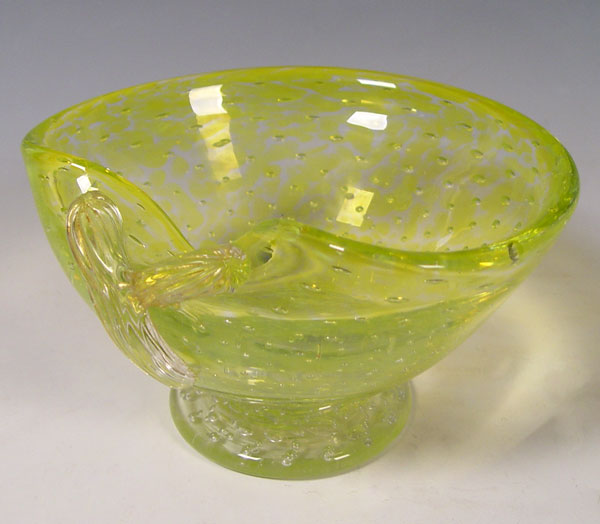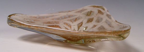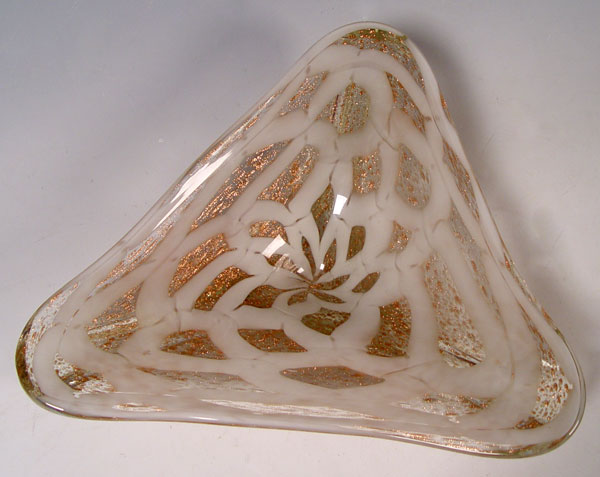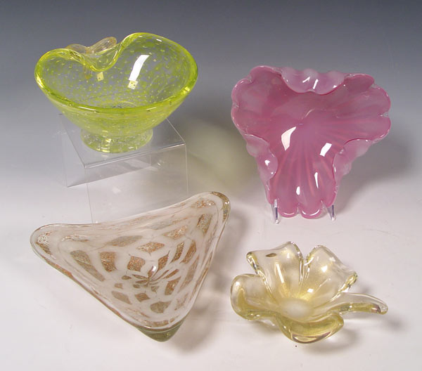 4 PIECE LOT ITALIAN ART GLASS: 1) Seguso vaseline pedestal bowl, 9'' dia. 2) Seguso pink opalescent dish, 9'' dia. 3) Fritelli Toso triangular dish with copper flecks, 12''. 4) Seguso Aventurine clover form dish, 7 1/2''.