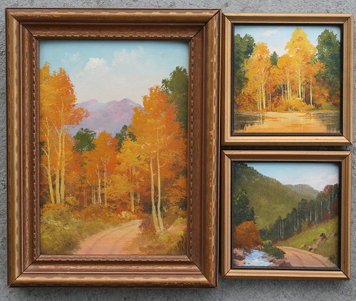 PAGE, Willard, (American, 20th C.): 3 Western OIL/Board Scenes, all monogrammed, with Page's stencil or label affixed verso, all titled; ''Beaver Pond'', 3'' x 3'', framed, 4'' x 4''; ''Mohawk Trail'', 3'' x 3'', framed, 4'' x 4''; ''Aspen Trail'', 7'' x 5'', framed, 8 1/2'' x 6 1/2''.