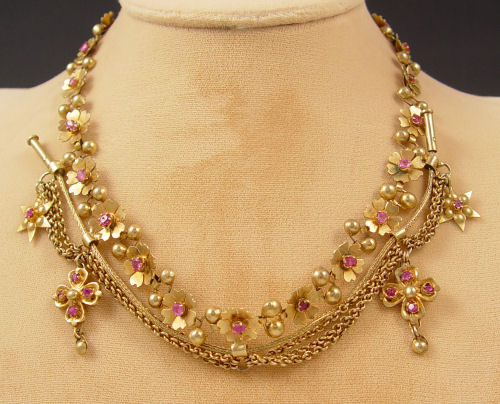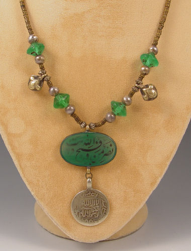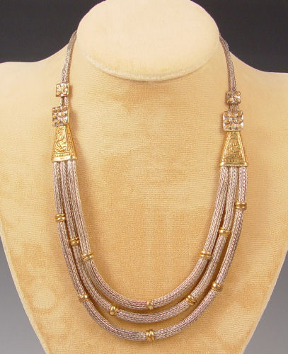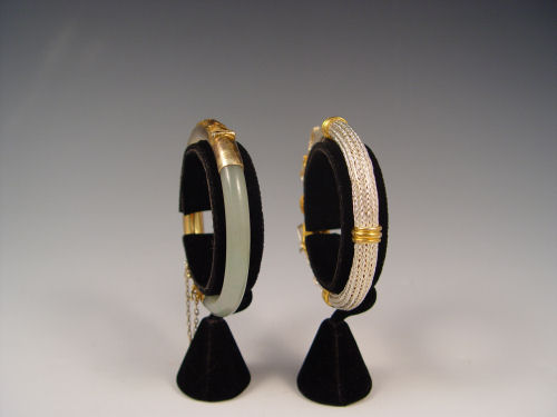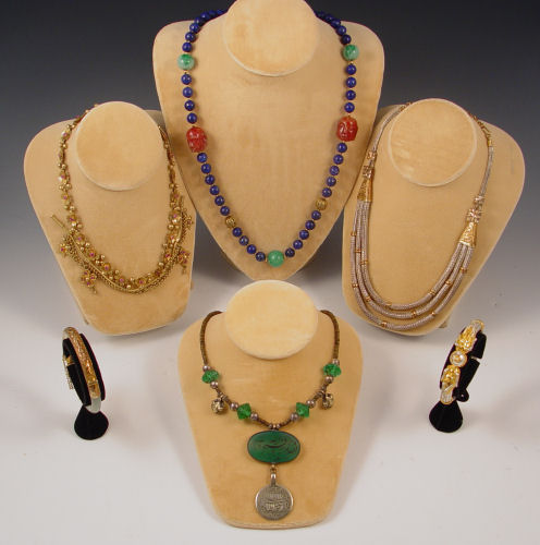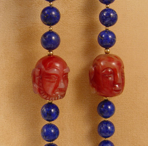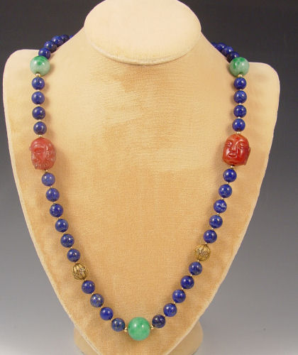 ESTATE COLLECTION OF JEWELRY FROM A WORLD TRAVELER: 1) Vermeil 2 Ctw pink sapphire necklace, prong set, 50 grams, 17''. 2) Lapis Lazuli beads, 10mm, strung with carved red stone and jadeite(?), vermeil filigree ball spacers and 14K clasp, 32''l. 3) Sterling dragon motif cable bracelet. 4) Sterling cable necklace 5) Vermeil jadeite bangle bracelet 6) Persian green stone necklace of unknown metal.