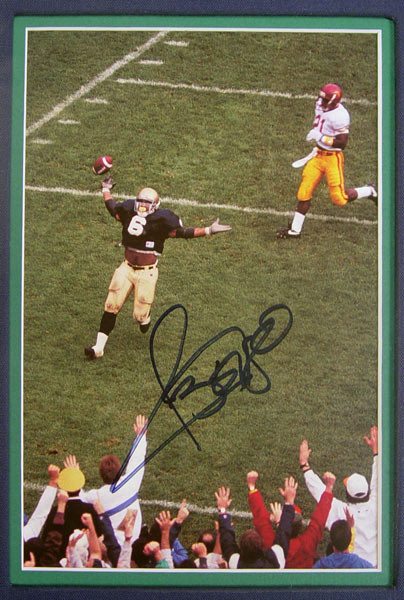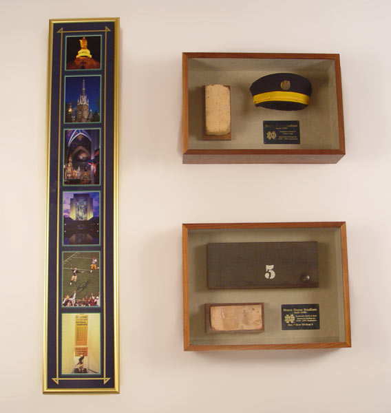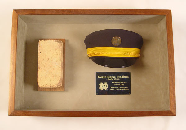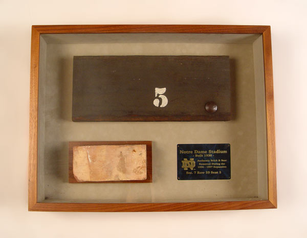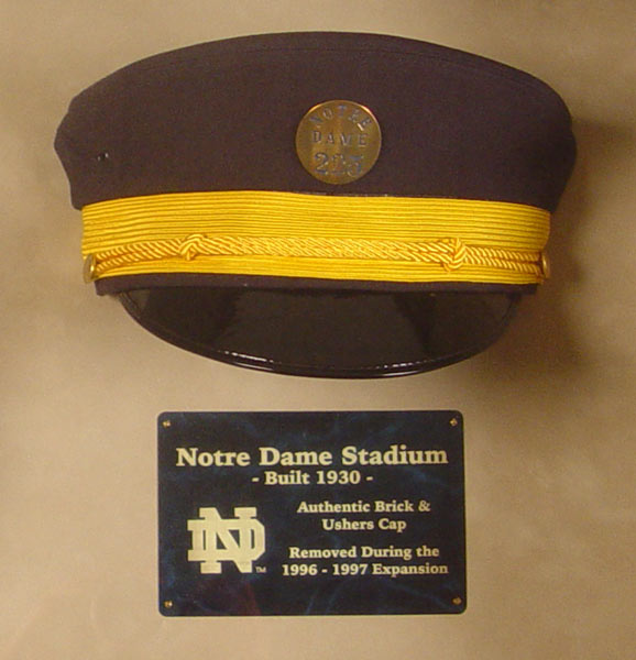 1930 NOTRE DAME STADIUM COLLECTION: Includes 1) Shadow box framed seat back & brick from original stadium built in 1930, from 1997 expansion. 19'' x 25'' x 5''. 2) Shadow box framed ushers hat and brick, also from the original stadium. 16 1/2'' x 25'' x 6 1/2''. 3) Framed photographs and autograph of Jerome Bettis. Measures 61 1/2'' x 12''. Great collection for a Fighting Irish collector.