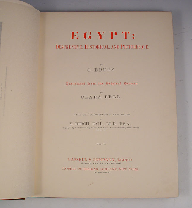 2 VOLUME PICTURESQUE EGYPT BOOKS BY G. EBERS: 2 volume set by G. Ebers, translated into English, published by Cassell Publishing Co. New York. Volumes measure 15'' x 12'' x 1 1/2''. Est. $300/500**