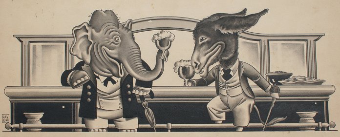 ROHN, Ray, (American, 1888-1935): Democratic Donkey and Republican Elephant Sharing a Beer, Ink Drawing with wash, 10 1/2'' x 22'', signed, unframed.