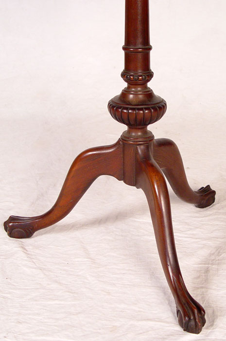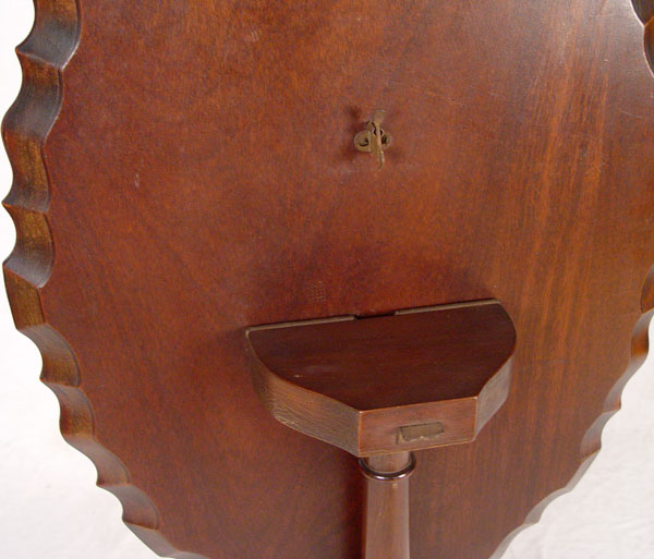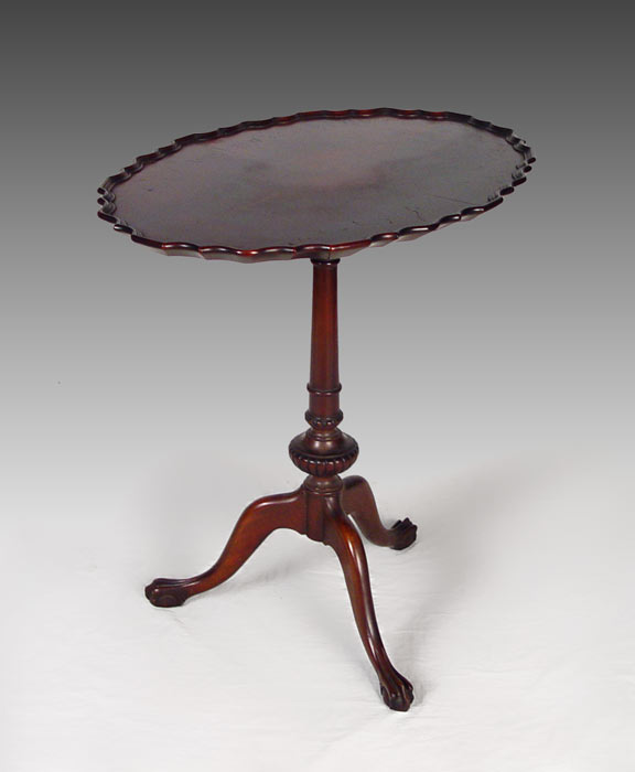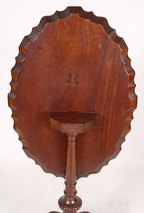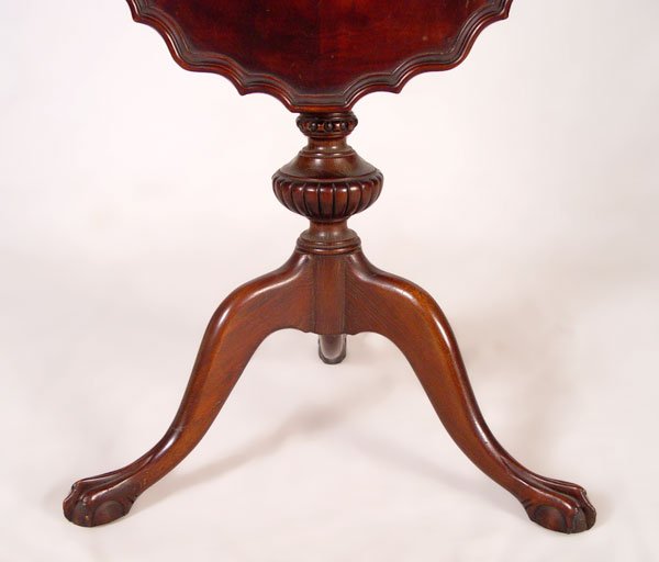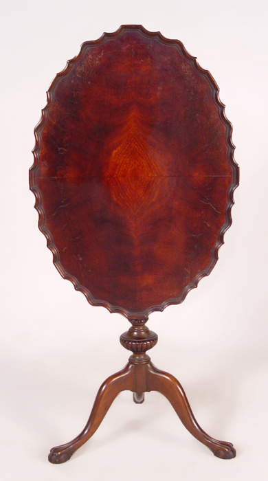 FLAME GRAIN MAHOGANY TILT TOP TEA TABLE BY FERGUSON: Carved pedestal under a scalloped edge top with matchbook veneer. 28''h., the top is 28 1/2'' x 20''.