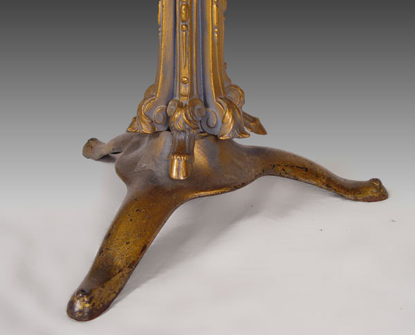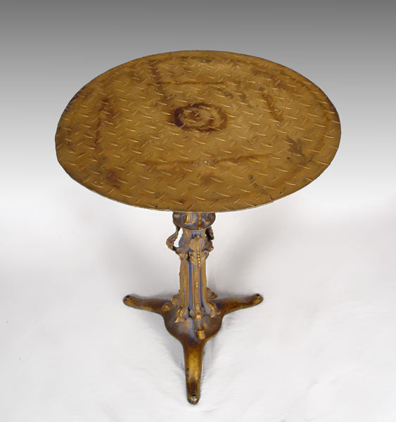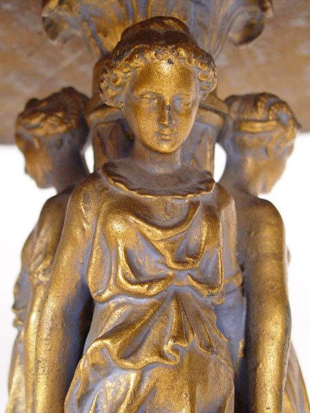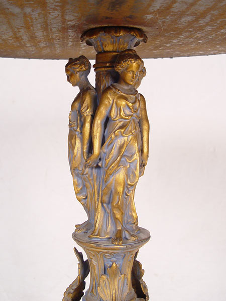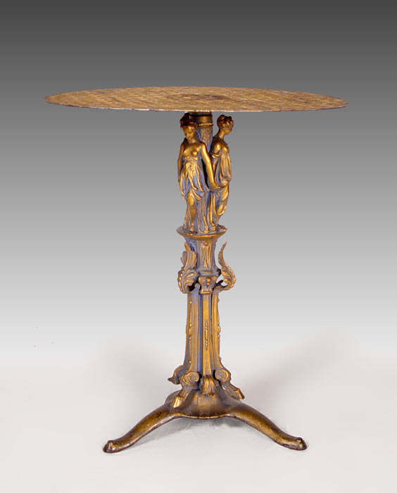 DECORATIVE FIGURAL BRONZED BASE TABLE: Three maidens at the base, of Art Nouveau design. Round iron top, nice patina. 28'' h. x 24 dia''.
