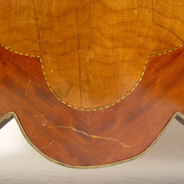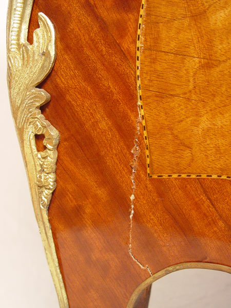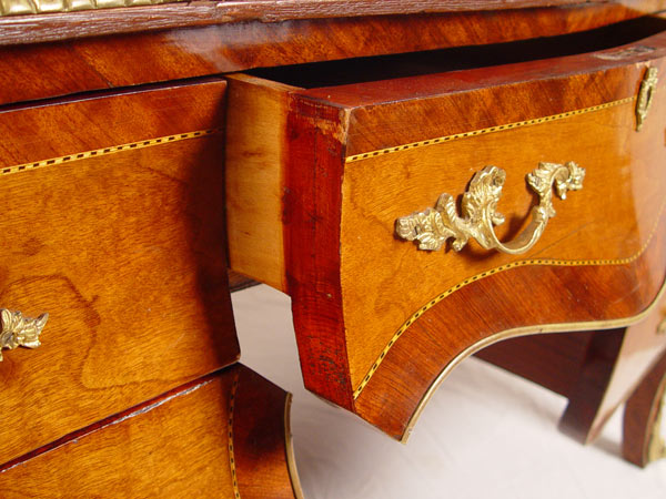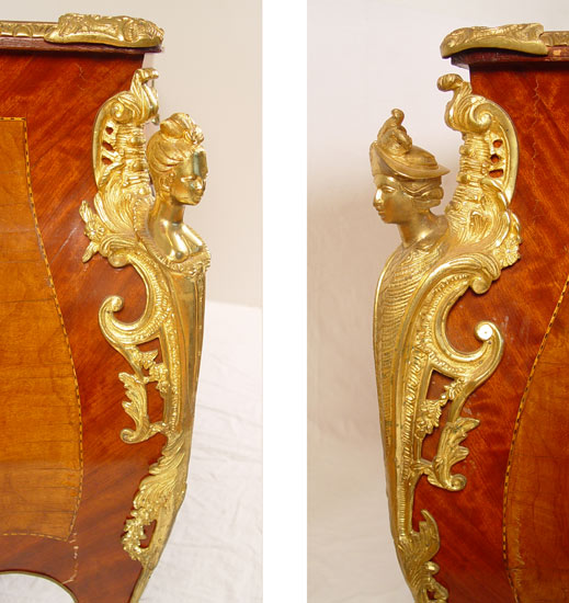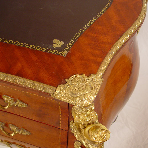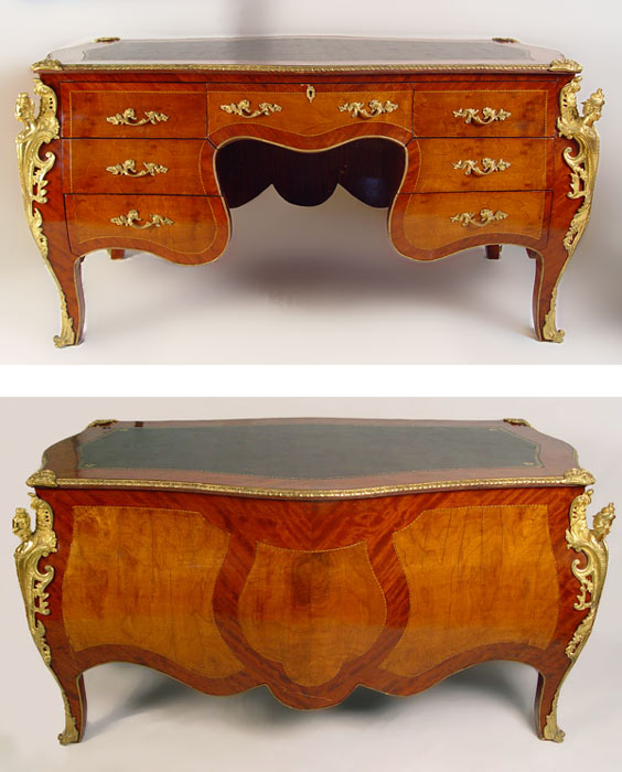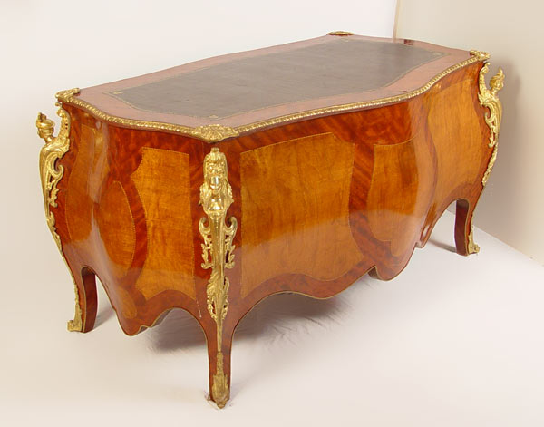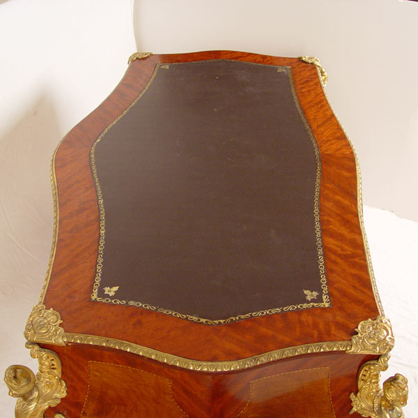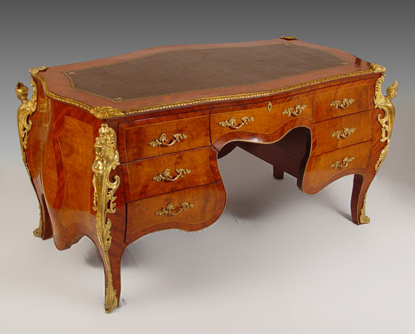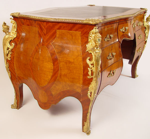 FRENCH ORMOLU MOUNTED BOMBAY BUREAU PLAT DESK: With figural ormolu, inset leather type top, trimmed in 3 dimensional ormolu. 2 color veneer throughout. Total of 7 drawers. 34'' h x 67'' x 34''