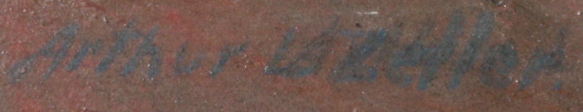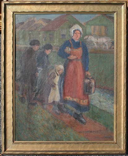 ZELLER, Arthur, (American, 20th C.): Dutch Mother Walking With Her Three Children Along a Canal, OIL/B, 20'' x 16'', painted period frame with wear, 24'' x 19 3/4''.
