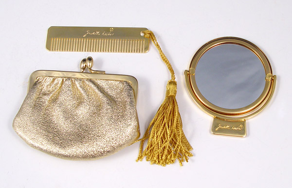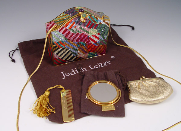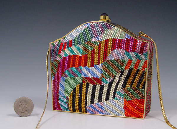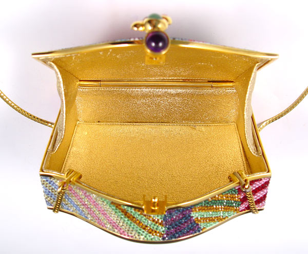 JUDITH LEIBER MULTICOLOR PURSE: Many color crystals on gold tone metal. Gold leather interior with chain, coin purse, mirror and change purse. Gemstone clasp. 3 1/2'' x 4 1/2''.
