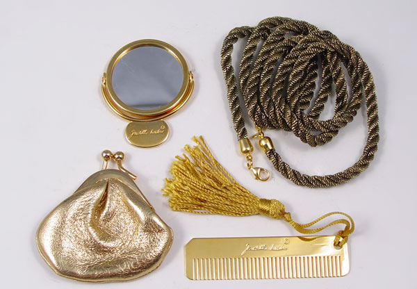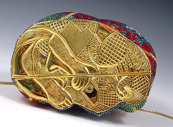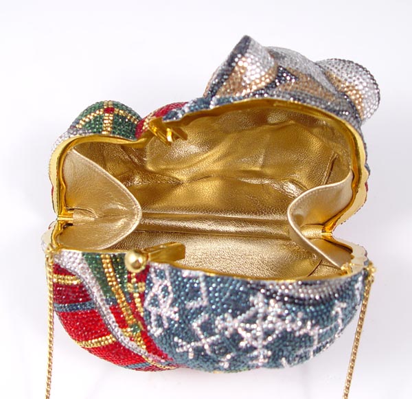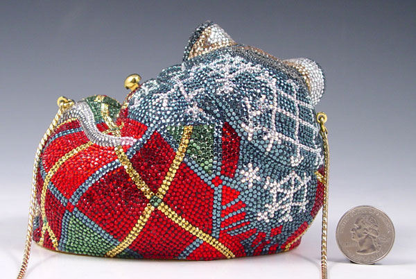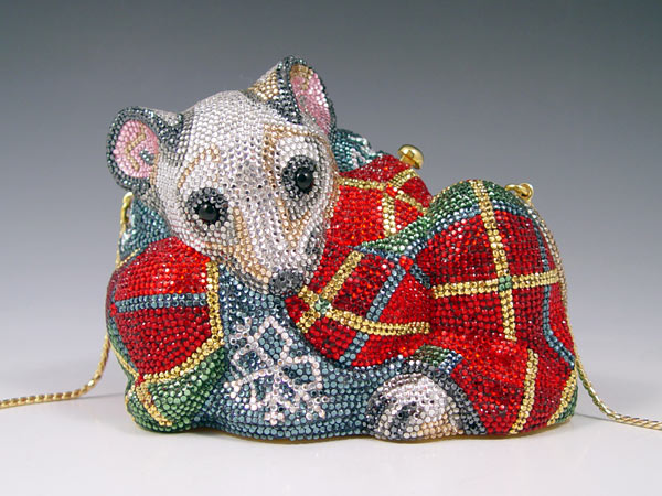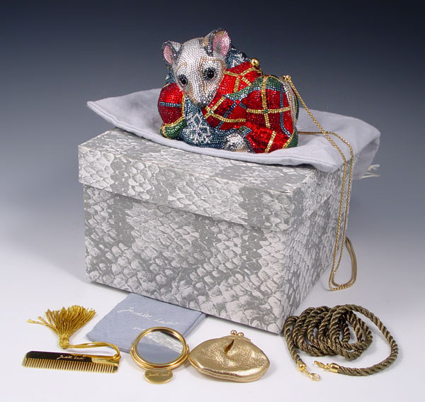 JUDITH LEIBER CRYSTAL MOUSE MINAUDIERE PURSE: Multi color Austrian crystal with onyx eyes. Includes the mirror, change purse and comb. Leather lined interior, hidden chain. 4 1/4'' x 5''.