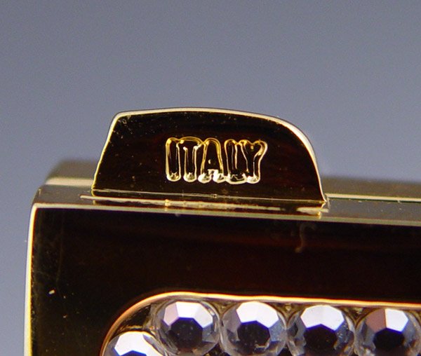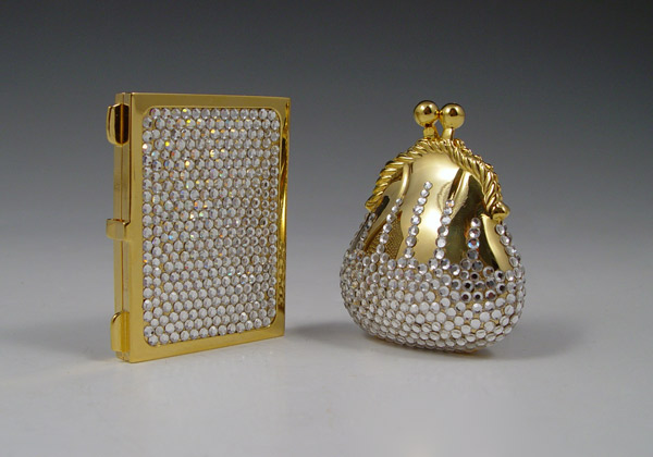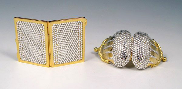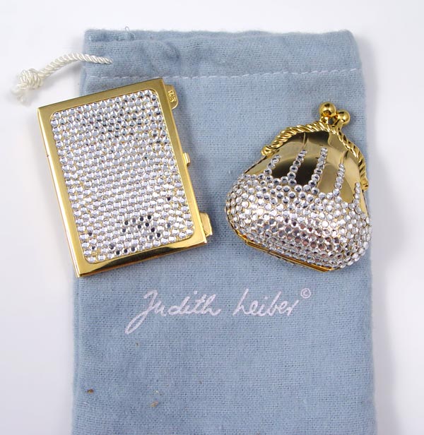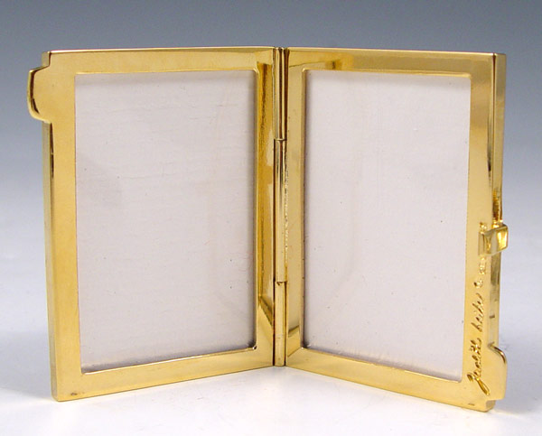 2 PIECE JUDITH LEIBER PILL BOX & PICTURE FRAME: 1) Pill box in the form of change purse, 2''. 2) Hinged double picture frame, 1 1/4'' x 1 3/4''. Both covered in crystals.
