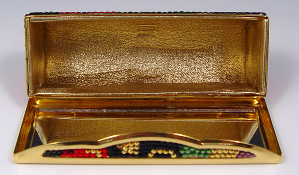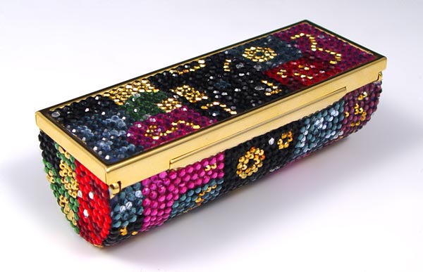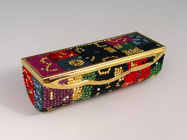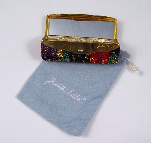 JUDITH LEIBER LIPSTICK COMPACT: Multi-color Austrian crystal covered hinged top with mirror. Retailed for $365. 3 1/2'' x 1''.