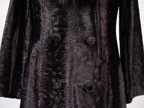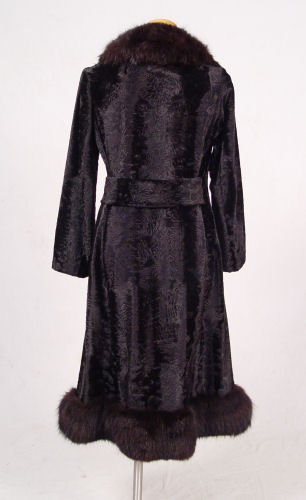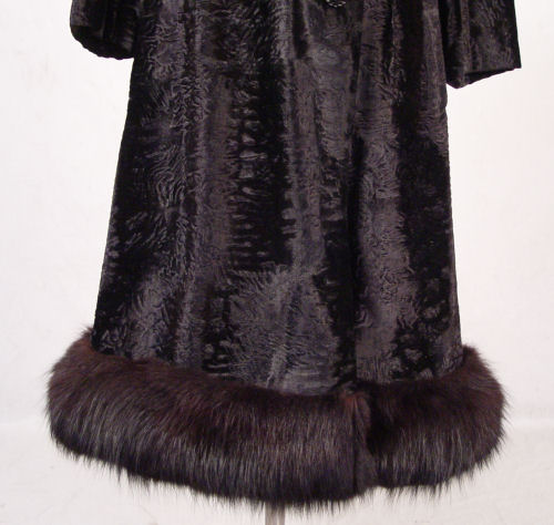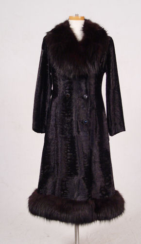STUNNING BLACK FOX FUR TRIMMED COAT: Black fox trim on faux lambs wool. Fox collar, and trim along the hem. 44'' long, 16'' across the shoulders. Made in England, Borella label.