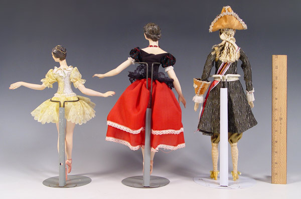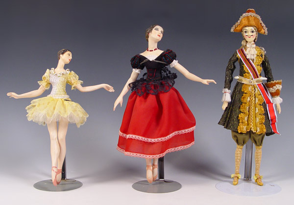 3 RUSSIAN BALLET DOLLS: Purchased in Russia by the consignor, as a fund raiser for students of the Ballet. 13-16 1/2'' tall. Hand painted ceramic, cloth bodies, dressed in costume.
