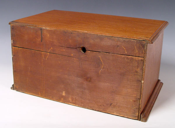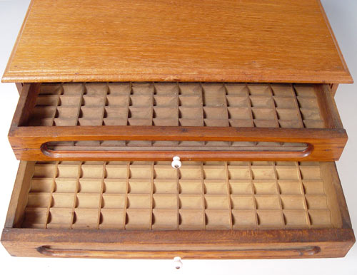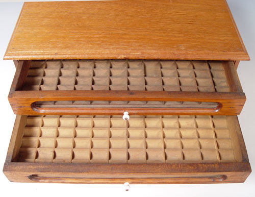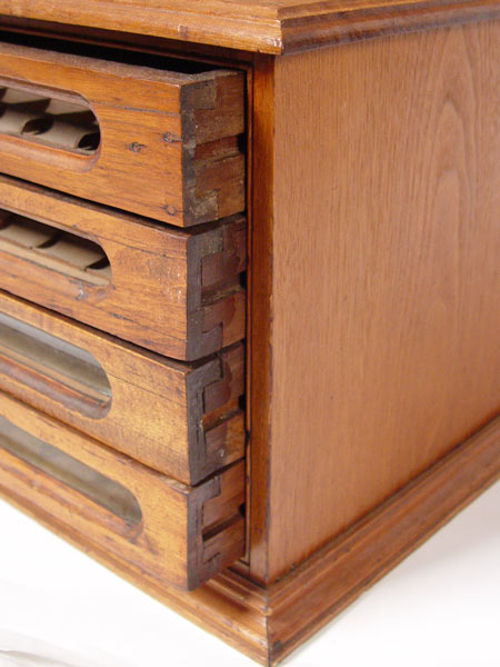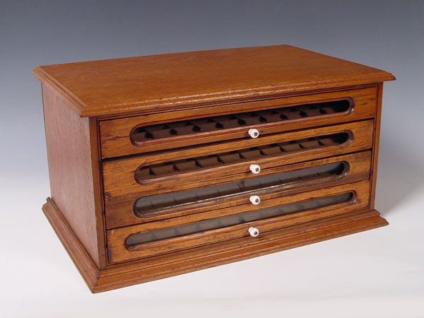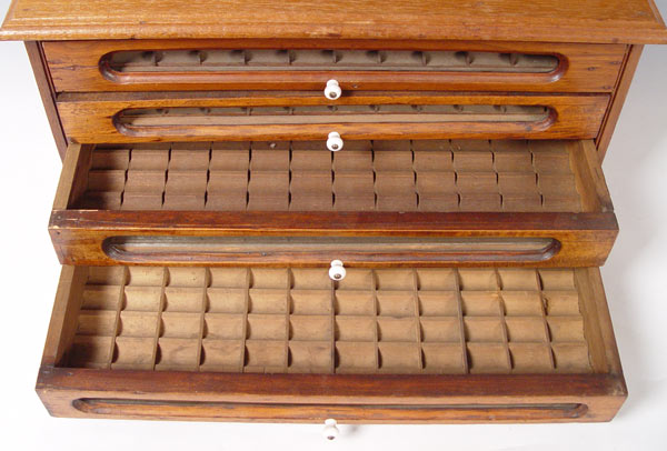 VICTORIAN WALNUT FOUR DRAWER SPOOL CABINET: Holds 480 spools of thread. Each drawer has a viewing window and white porcelain knobs. Measures 11'' h. x 20 1/2'' x 13''