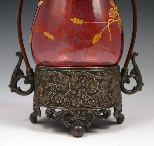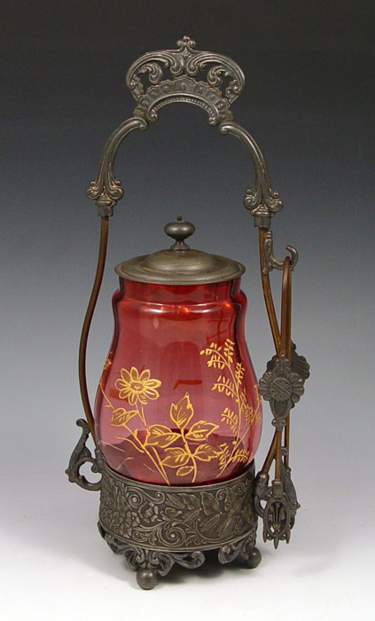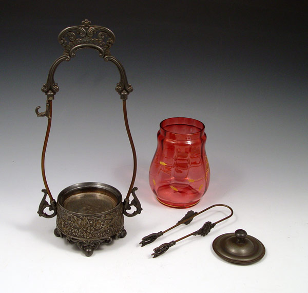 BABOUR SILVERPLATE & CRANBERRY GLASS PICKLE CASTOR AND TONGS: The cranberry glass with enamel decoration, 4 3/5''. Babour frame and holder has lost its silver plating, as has the tongs. 11 3/4'' tall overall.