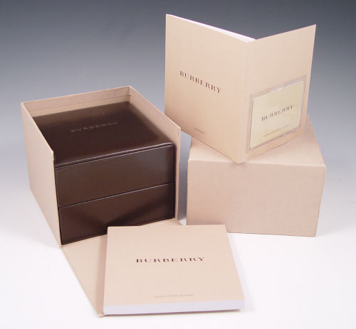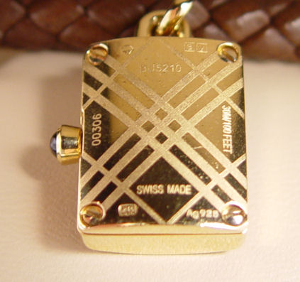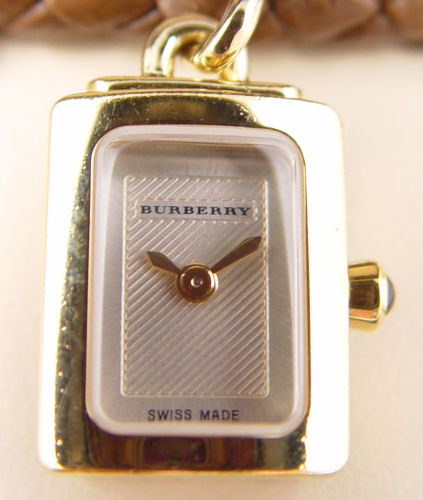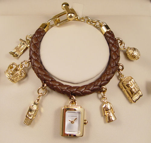 BURBERRY WATCH CHARM BRACELET: New in the presentation box with Warranty and instruction manuals. Good working order. Brown braided leather bracelet with gold tone charms, one charm is the watch. 6 3/4''l.