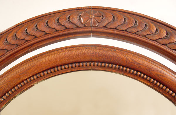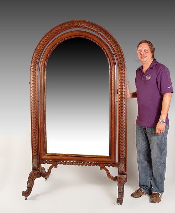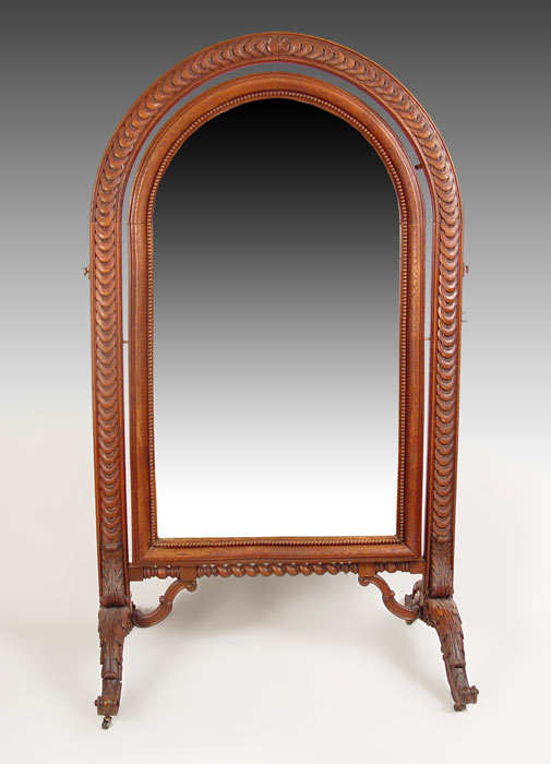MONUMENTAL CARVED OAK CHEVAL MIRROR: Measures 79'' h. x 44 1/2'' x 33'' overall. Mirror 53'' x 29 1/2'' Est. $1200/1400**