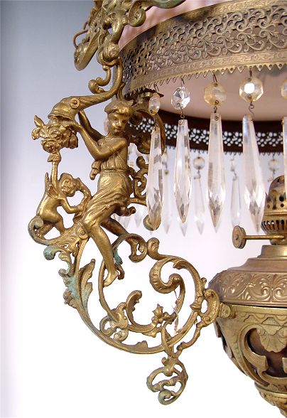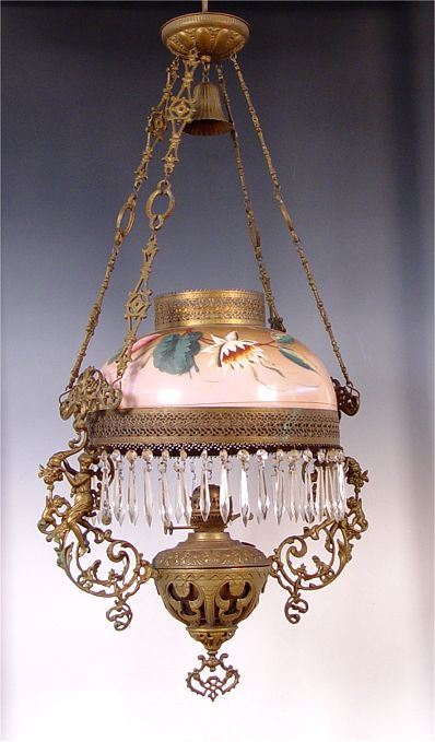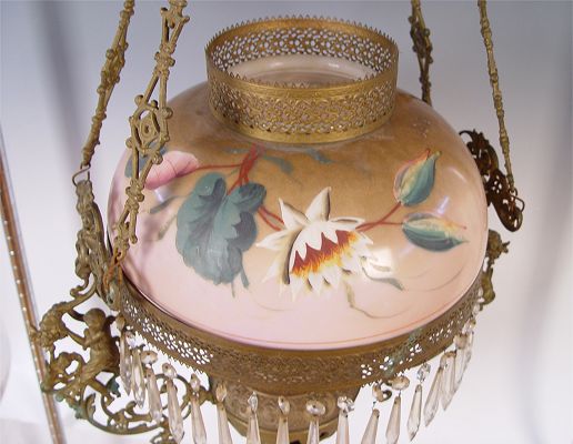MID 19TH CENTURY JOHN SCOTT HANGING OIL LAMP: Not electrified. Hand painted shade with crystal prisms. Foliate and scroll design metal with cherubs. Marked John Scott Made in England. Hangs 38 1/2'' long x 20 1/2'' at widest point.
