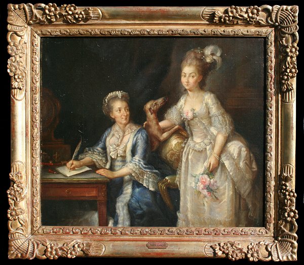 GOUPIL, Jules, after, (1839-1883): Two Ladies Penning a Letter with Playful Dog in an Interior, OIL/Canvas, 19 1/2'' x 23'', carved and gilded frame, 25'' x 29''. Est. $2000/4000**