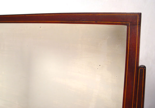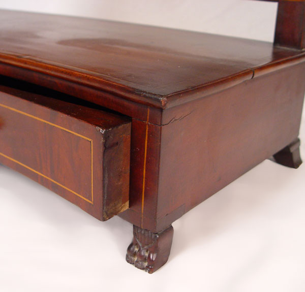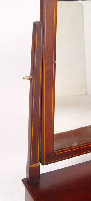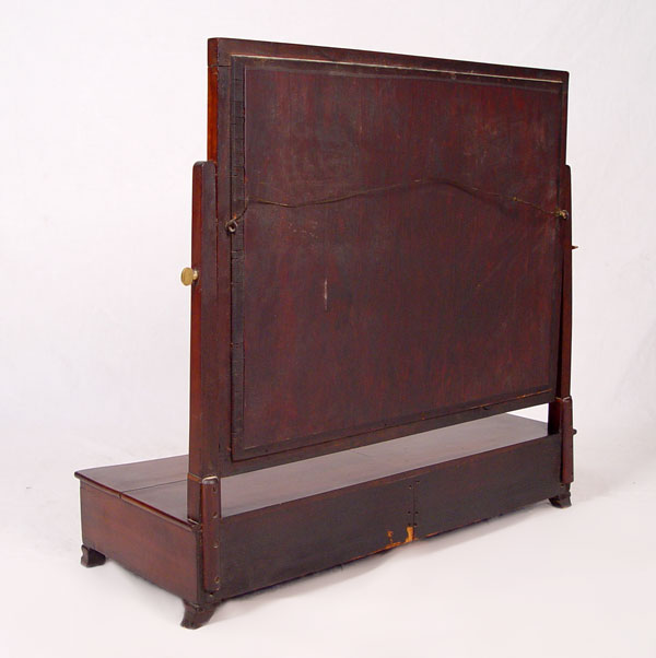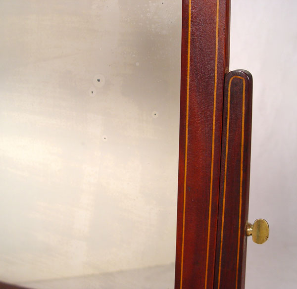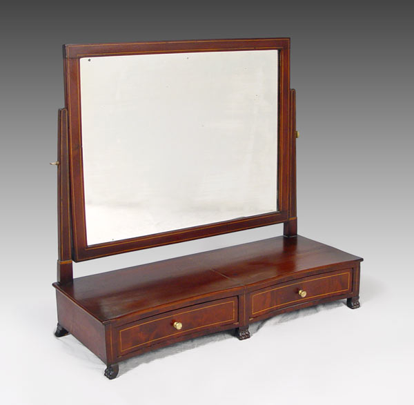 LATE FEDERAL STYLE INLAY MAHOGANY SHAVING MIRROR: String inlay mahogany swivel mirror, on 2 drawer stand with iron paw feet. 27'' h. x 29 1/4'' x 11''