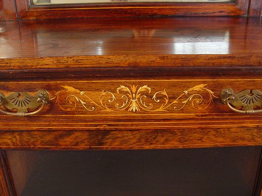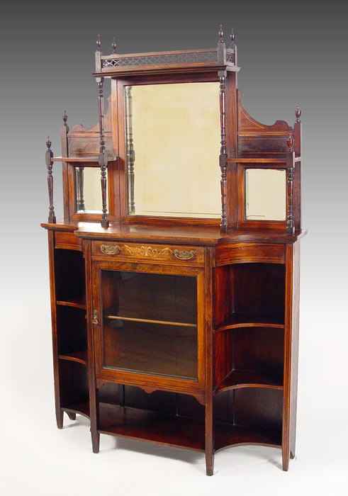 VICTORIAN ROSEWOOD & STRING INLAY ETAGERE SIDE CABINET: Combination of beveled mirrors, tiered shelves with turned supports and finials. Cut gallery top sitting over a glass door. Single drawer inlaid bookcase with side to side open shelves. Complete with key. 76'' h. x 48 3/4'' x 14'' deep