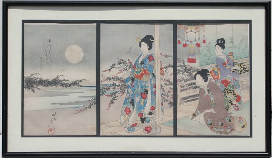 CHIKANOBU, Toyohara, (Japanese, 1838-1912): ''Ladies in Waiting of the Chiyoda Palace'', Woodblock Triptych, 14'' x 9 1/8'' each, framed and matted, 19'' x 33''. Est. $400/600**