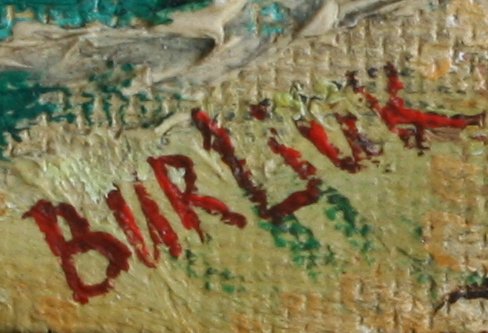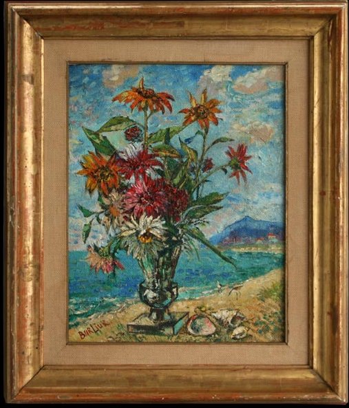 BURLIUK, David, (Russian, American, 1882-1967): Still Life of Flowers on Coast with Shells, Birds, OIL/Masonite, 15'' x 12'', gilded frame 21 1/2'' x 18 1/2''. Est. $10000/20000**