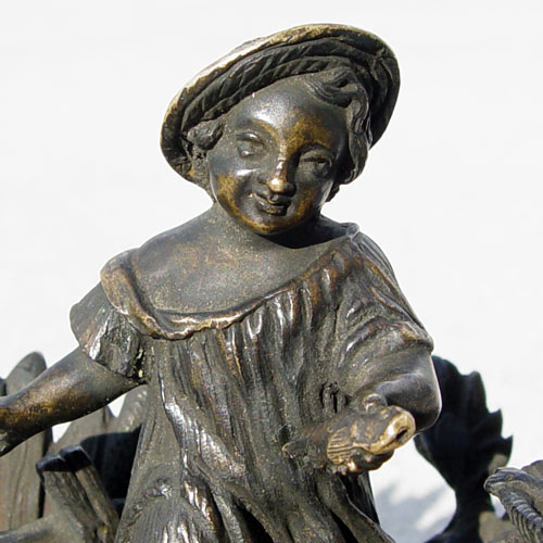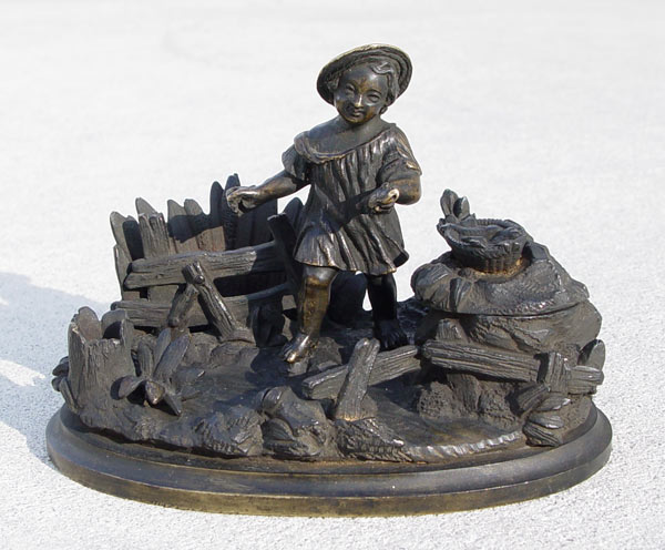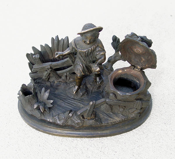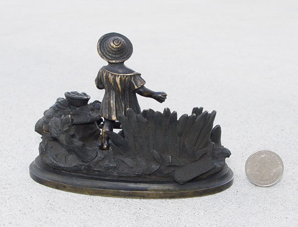 BRONZE INKWELL OF A GIRL IN FIELD: Missing glass insert. Unsigned. 3 1/2'' h. x 5'' x 3''. Est. $200/400**