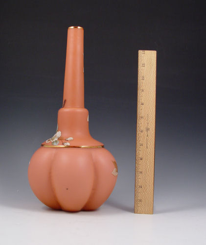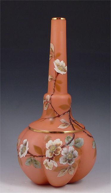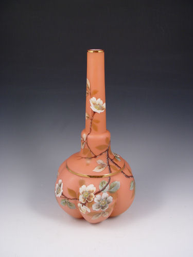 WEBB VICTORIAN ART GLASS BOTTLE NECK VASE: Attribution. Melon ribbed base, enameled decoration. 13 1/4'' h