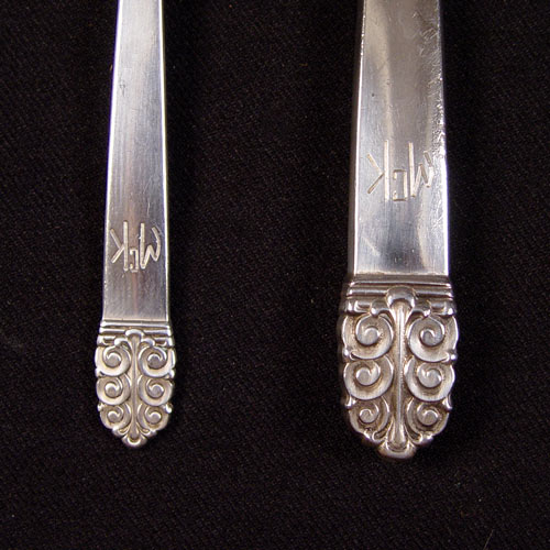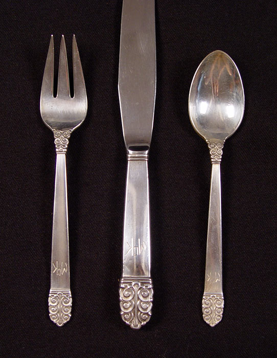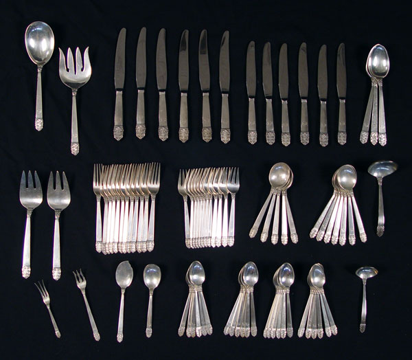 INTERNATIONAL NORTHERN LIGHTS STERLING FLATWARE: Complete service for 12, approx. 85 pieces in the Northern Lights pattern by International Silver to include 12 forks (7 1/8''), 12 salad forks (6 1/4''), 24 teaspoons (6''), 12 soup spoons (6 1/2''), 6 knives (9 3/4''), 6 knives (8 3/4''), 3 tablespoons (8 3/8''), large serving spoon (9 1/8''), 2 serving forks (8 5/8''), cold meat serving fork (9''), ladle (5 3/8''), ladle (6 1/4''), jelly server (6 1/2''), sugar scoop (6''), cocktail fork (5 3/4''), lemon fork (4 3/4''). Monogrammed. Comes in wood silver chest 3 1/2'' h x 15'' x 11 1/4''. Approx. 126.1 troy oz.