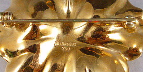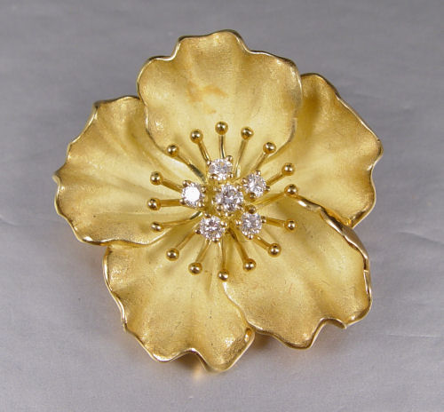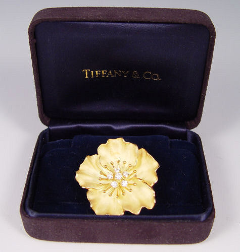 18K TIFFANY & CO DIAMOND ''DOGWOOD'' FLOWER PIN PENDANT: 18K yellow gold pin depicting a stylized flower contains six round brilliant cut diamonds, total weight .40 Ct. The diamonds average VVS-VS in clarity and E-F in color. The diamonds are prong set. Bar pin closure. Weight: 23.7 grams. Approx. 1 1/4'' in diameter. The Dogwood earrings are at the previous lot 96. Est. $1800/2000**