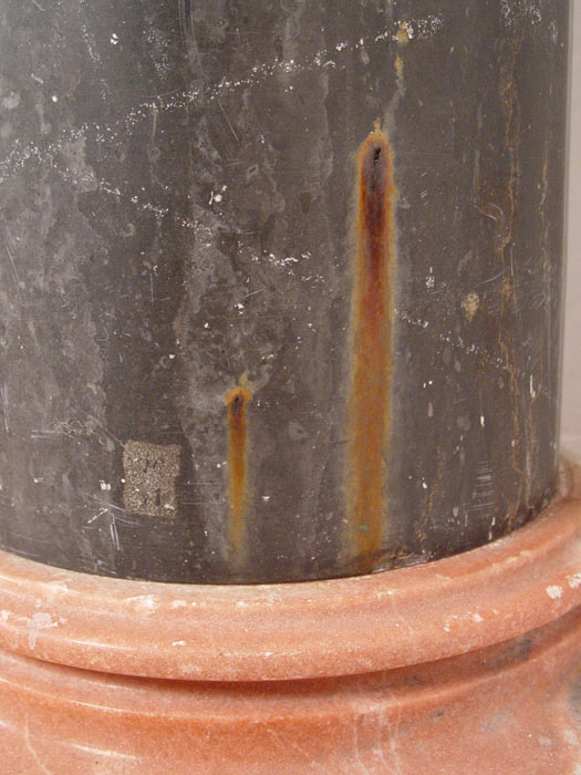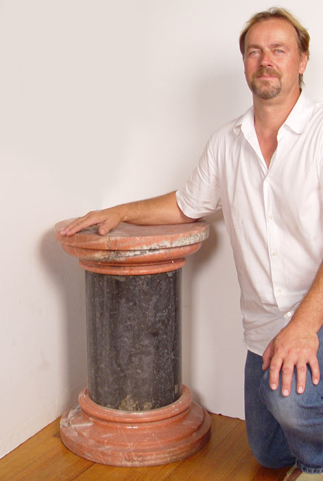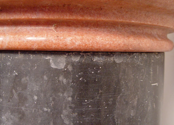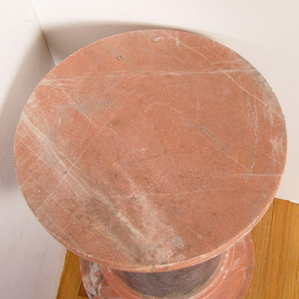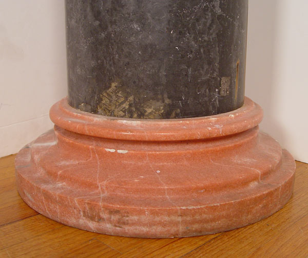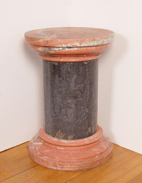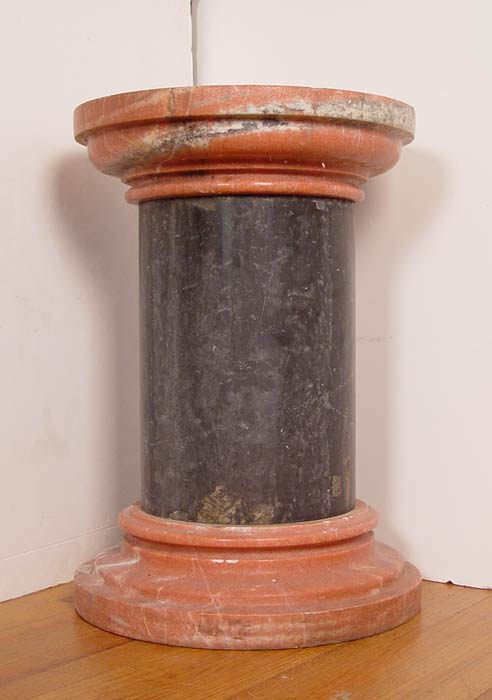 RED & BLACK MARBLE PEDESTAL: Three part, measures 27 1/2'' h. x 19 1/2'' dia.
