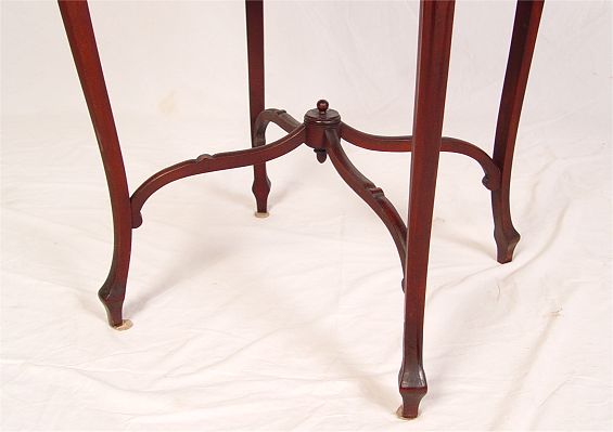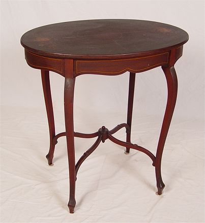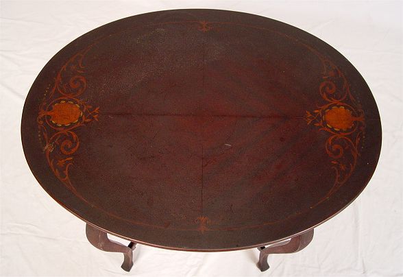 MARQUETRY INLAY MAHOGANY PARLOR TABLE: Graceful cabriole legs joined by curved stretchers. Oval top, alligator finish. Early 20th C. Measures 29 1/2'' high x 21 1/4'' x 29''.