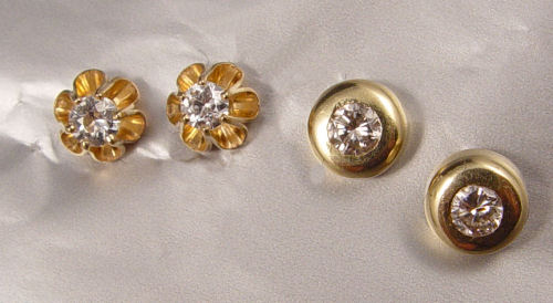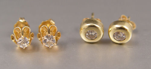 2 PAIR DIAMOND STUD EARRINGS: 1) 14K yellow gold earrings contain 2 round brilliant cut diamonds. Weight: .50 Ct. Approx. Rated SI2 in clarity and I-J in color. The diamonds are bezel set. Weight: 2.2 grams. 2) 14K yellow gold earrings contain 2 old European round cut diamonds. Weight: .50 Ct. Approx. Rated VS1 in clarity and H-I in color. The diamonds are prong set. Weight: 1.6 grams.