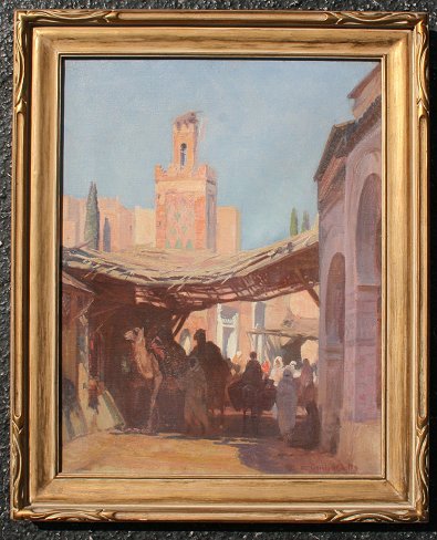 COUTTS, Gordon, (American, 1880-1937): Moroccan Bazaar Scene with Figures and Camel, Oil/Canvas, 18'' x 14'', signed, encased in period carved and gilded impressionist frame, 21 1/2'' x 18''.