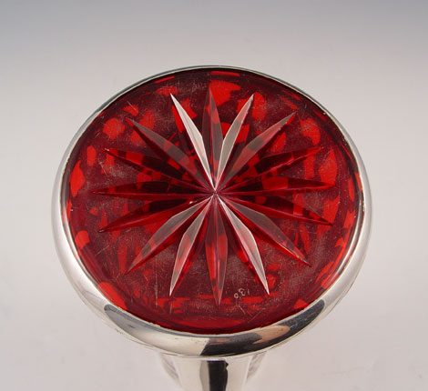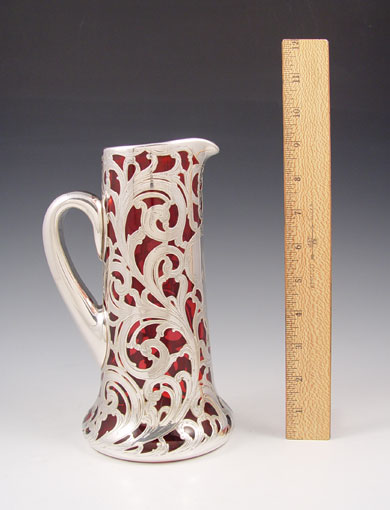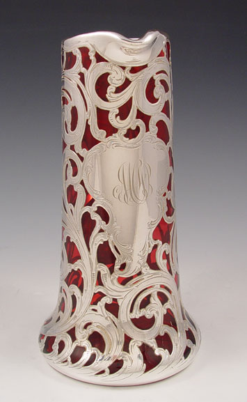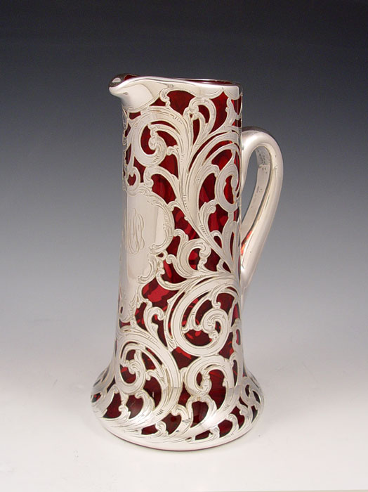 ALVIN STERLING SILVER OVERLAY CRANBERRY GLASS PITCHER: 999 fine silver overlay in a floral design, monogram, 9 1/4''h.