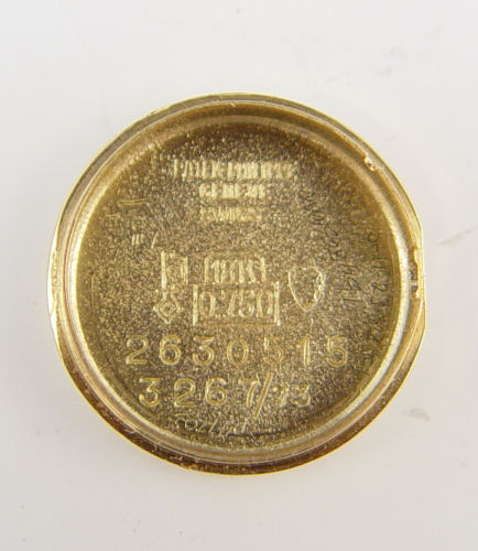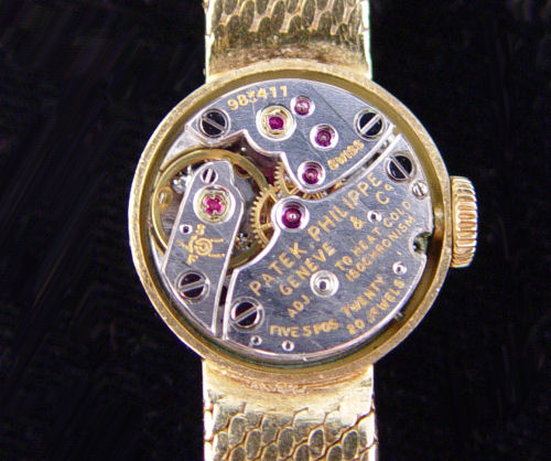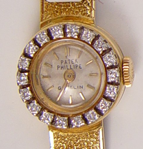 18K PATEK PHILIPPE LADY'S WRISTWATCH: For the Swiss house of Gubelin. 18 round brilliant cut diamonds, approx..5 Ct., frame the dial. Diamonds average VS in clarity and G in color. Signed in four places, back, dial, movement and clasp. Movement #983411, 5 adjustments and also adjusted to temperature changes. High grade 20 jewels. Case # 2630515-3267/73. The dial shows typical aging and has been redone. Excellent running condition. Weight 30.1 grams.