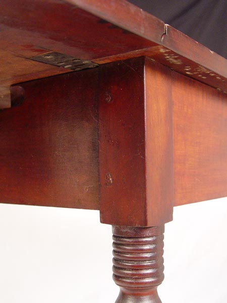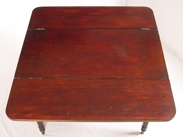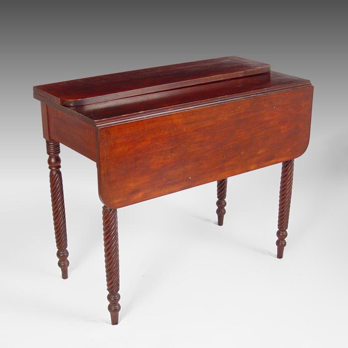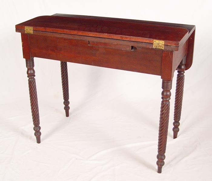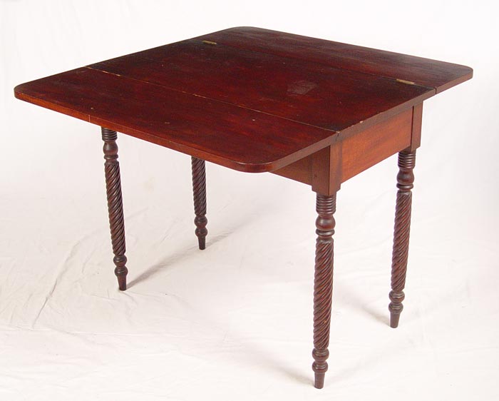 TOBACCO TWIST LEG DROP LEAF TABLE: Swing support holds the top leaf, nicely carved tobacco twist legs. 28 1/2''h. x 35'' long x 17'' or 37 with leaves extended.