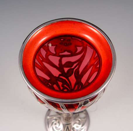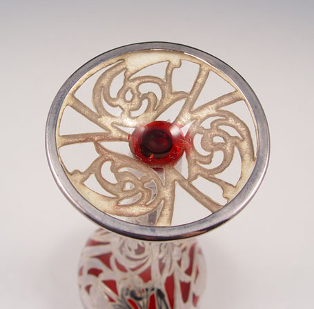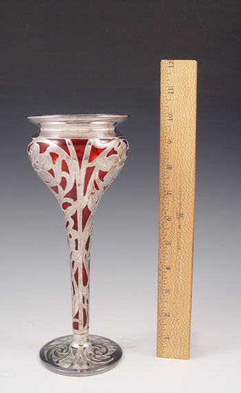 STERLING SILVER OVERLAY CRANBERRY GLASS VASE: Art Nouveau form and floral decor, cranberry glass with clear base. 10''h., 4'' rim.