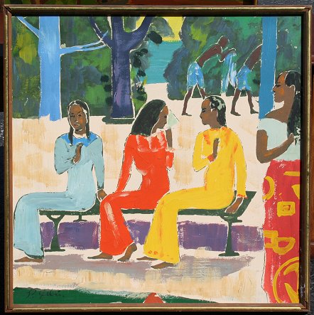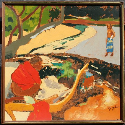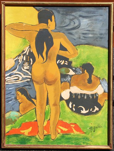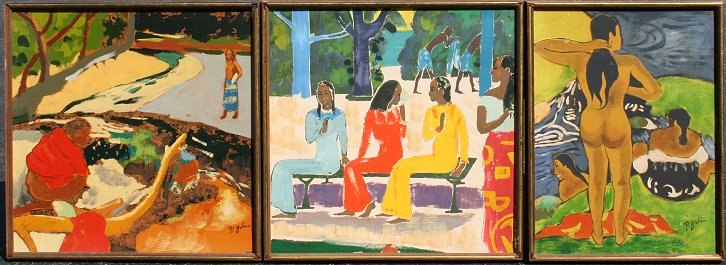 3 TAHITIAN ISLAND SCENE PAINTINGS AFTER GAUGUIN: 3 Oil/Board paintings. 1)Island Girls Bathing, 24'' x 18'', illegibly signed. 2)Seated figures in a park, 24'' x 24'', illegibly signed. 3)Squatting figure with approaching female, 24'' x 24'', illegibly signed. All encased in matching wooden frames with metal accents.