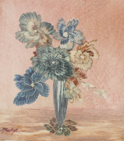 RULOF, Jozef, (Netherlands, 1898-1952): Floral Still Life, Oil/Masonite, 23'' x 21 3/4'', signed, framed, 29'' x 28'', dated 1946 verso. Jozef Rulof was a very good instrument for the masters. Alcar, his personal master, had been a famous and well known painter of art during his last life on earth. By training and developing Jozef's medium-ship Alcar brought the trance by him to such a high level that masters of the other side could take over his physical organism. This enabled them to let a number of painters who had passed over to the other side many years before, to give evidence of their existence and that their talents were still there. This excerpt was taken from the mogenblue.nl website, followers of the University of Christ.