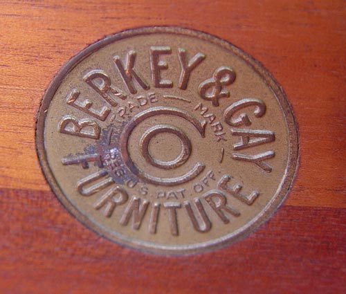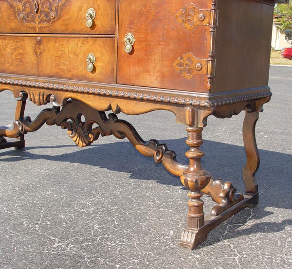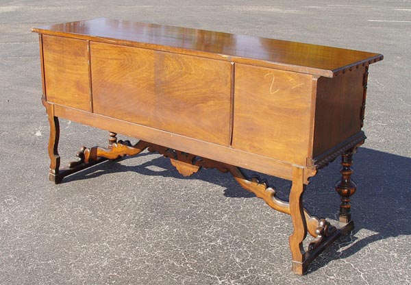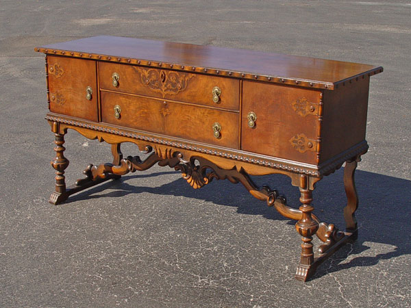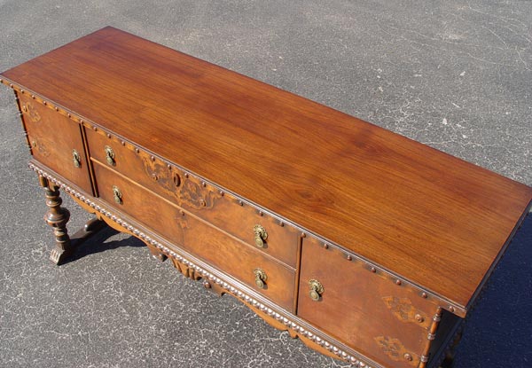 EARLY 20TH C BERKEY & GAY SIDEBOARD: Central drawers flanked by doors, drop pulls, large decorative strap hinges, ornate scrolled and carved stretchers. Label intact. Measures 37'' high x 74'' x 22 1/4''